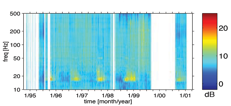 从1995年1月到2001年1月,来自加利福尼亚州苏尔点大陆架上接收机的频谱图,使用1天平均值。秋季和冬季17-20赫兹的环境噪声增加是由于蓝鲸和露脊鲸的叫声。