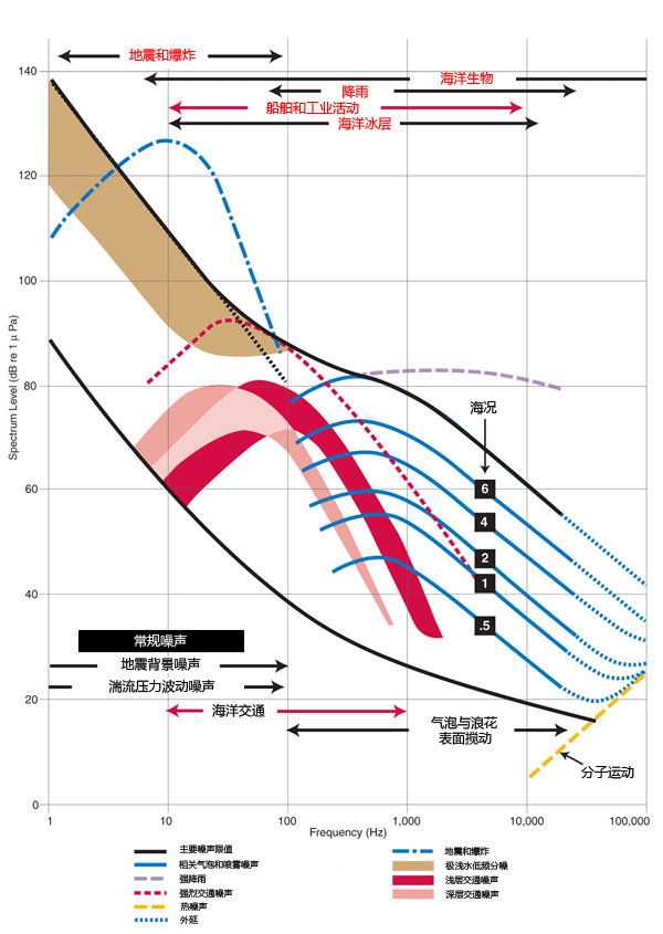 环境噪音的主要来源可以根据声音的频率进行分类。在20-500 Hz的频率范围内,环境噪声主要是由远处船舶产生的噪声引起的。即使在去除靠近接收器的船舶产生的任何噪声后,仍然可以检测到远处的船舶。在船舶交通繁忙的地区,噪声量更大。南半球的船舶较少,因此低频环境噪声水平通常至少低10 dB。随着公海上船舶数量的增加,由船舶产生的噪声也有所增加。在500-100,000 Hz的频率范围内,环境噪声主要是由于破碎海浪引起的喷雾和气泡。随着风速的增加而增加。在约100,000 Hz以上的频率,由水分子的随机运动产生的热噪声占主导地位。这种噪声设定了可以测量到的最低声音水平的终极限制。海洋中的背景声音可以总结在一个图表中,该图表显示了不同频率下的典型声音级别。此图表中的声音级别是相对于1 µPa在1 Hz宽频率带中的分贝数,通常写作dB re 1 µPa2/Hz。