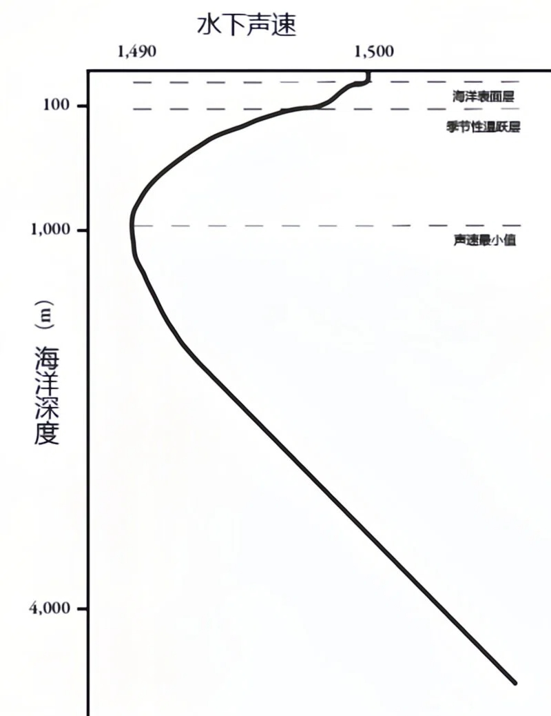 不幸的是,答案并不是那么简单。海水中的声速不是一个恒定值。它在不同地方、不同季节、不同时间和不同水深都有微妙的变化(百分之几)。尽管声速的变化不是很大,但它们对声音在海洋中的传播有重要影响。