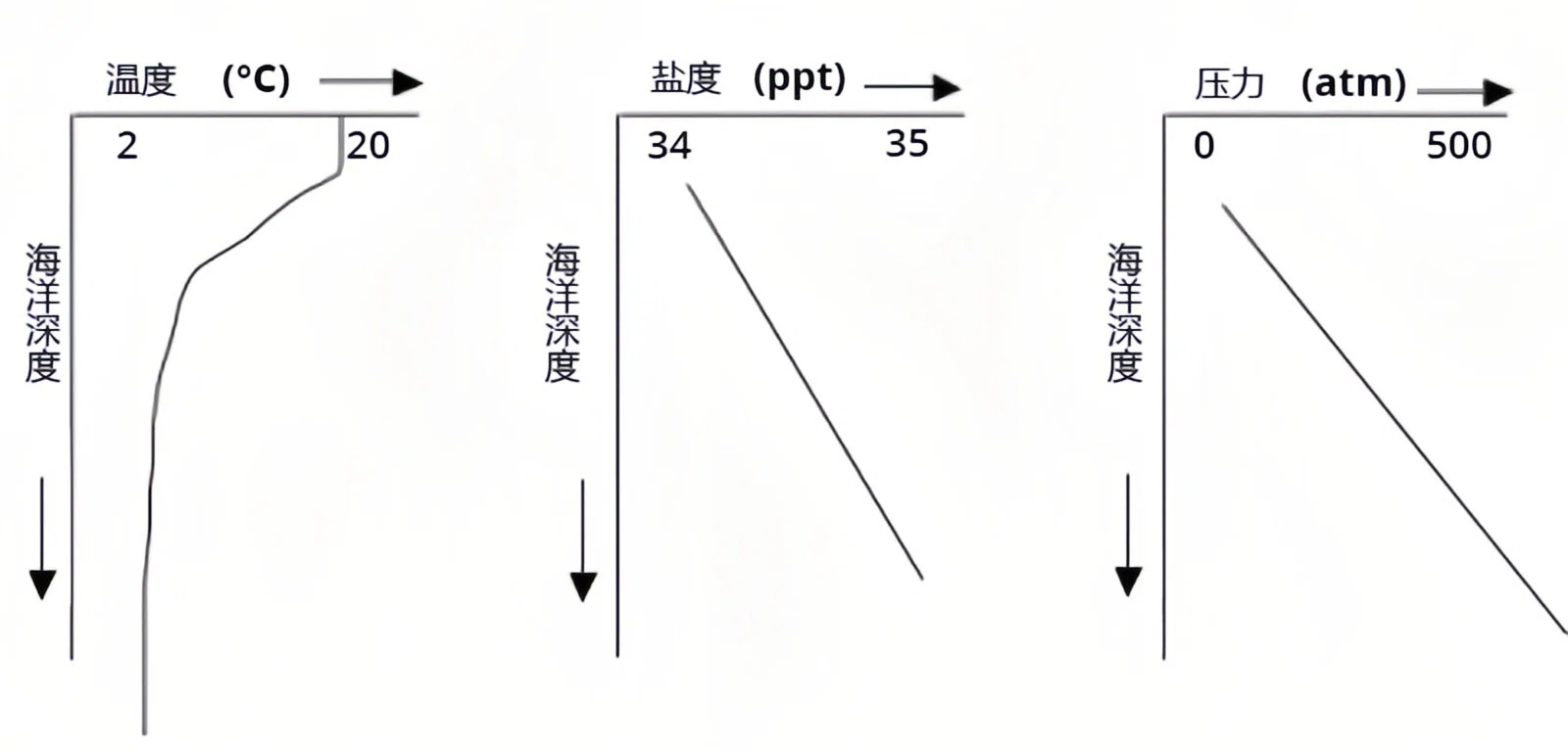 从这些资料中可以清楚地看出,温度变化很大,从中纬度地区表面附近的20摄氏度(°C)降低到海底附近的2摄氏度(°C)。另一方面,盐度变化很小,从34到35实用盐度单位(PSU),大约从34到35千分之一(ppt)。最后,压力变化很大,从表面的0增加到海底的500大气压(atm)甚至更多。
